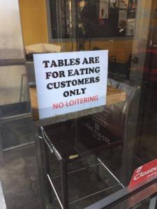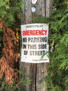 The sign below is noteworthy for the sheer number of different ways in which it says “no.” Let’s enumerate them, for the record. First is (1) the scary electricity symbol at left, which would make any reasonable person want to stay away. Next is (2) the universal “no people!” symbol at right. Then there’s (3) the very general warning of “DANGER.” Then the sign gets more specific. Not just danger, but (4) danger due to “High Voltage.” If you’re not convinced by risks to your personal safety, maybe you’ll respect property rights? So next, there’s (5) “No Trespassing.” Then there’s (6) reference to being fined, as well as (7) to being prosecuted. Then (in the fine print) there’s reference to (8) the by-laws of the TTC (Toronto Transit Commission) as well as to (9) the Province of Ontario’s relevant legislation, the Trespass to Property Act. That’s 9 ways of saying the same thing. As normative signs go, it’s not exactly poetic, but it is certainly emphatic.