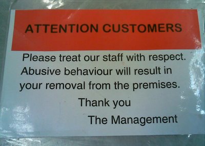 Here’s a fave of mine from a few years ago. (I blogged about it a few years ago on my Business Ethics Blog.) I love the polite “please,” combined with an announcement to all customers that insinuates that some (many? most?) customers are jerks.