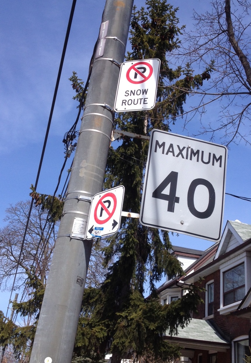 This is on a street in Toronto. Most of the lamp-posts along this street have “No Parking” signs. A few of them — maybe every third post — have additional signs saying why you’re not allowed to park there, namely because it’s a Snow Route, a road that gets priority snow-removal during especially big snowfalls.
