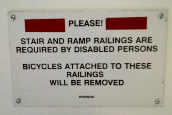 Next, this is a sign in a category that interests me, namely signs that provide a reason for what they ask you to do or not to do. This sign points out that there’s a good reason not to lock your bike to the stair railings, namely that some people actually rely on such railings as aids to mobility.