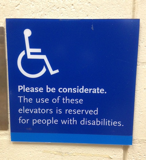 Fourth, note that although the sign starts with a plea to “be considerate,” it next goes on to say something more categorical: “This elevator is reserved for people with disabilities.” [emphasis added]