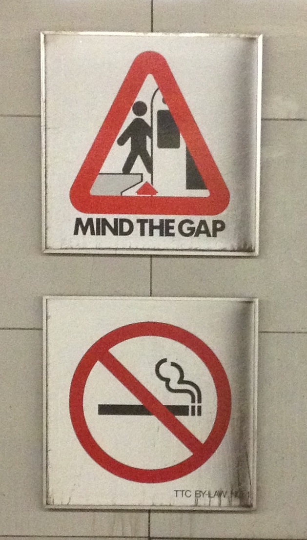 More seriously: it’s also interesting that the normative force behind these two signs is quite different. The lower one — No Smoking — has the force of law, and is backed by fines. The upper one — Mind the Gap — is “merely” very very good advice. Does pairing them like this have some effect on the psychological force of one or the other?