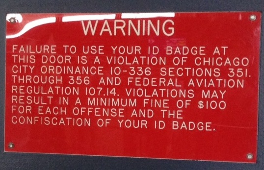 First, take a look at the red Warning sign on the right, which explains the penalty for failure to use your ID badge when exiting through this door. The “minimum” fine is $100, but that fine only “may” be imposed, or not, and in the latter case as Wayne points out the true minimum fine is $0.