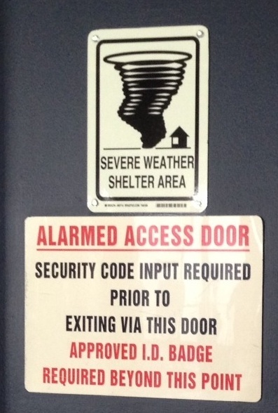 Next, consider the pairing of signs at the left-hand side of the door. The top one indicates that this door leads to a “Severe weather shelter area.” Unfortunately (for most of us!) the bottom sign says that you need to input a security code prior to using the door. So, in case of tornado, I guess it sucks not to have one of those. (In fact, I suspect the code is only needed in order to avoid an alarm going off, rather than to make the door open, but the sign is at least unclear about that. And in case of tornado, that’s the last thing you need.)
