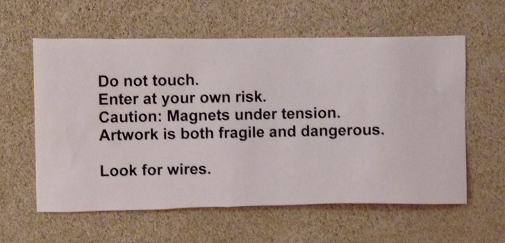 This was taken at the University of Toronto’s art gallery. It reads “Do not touch. Enter at your own risk. Caution: magnets under tension. Artwork is both fragile and dangerous. Look for wires.”