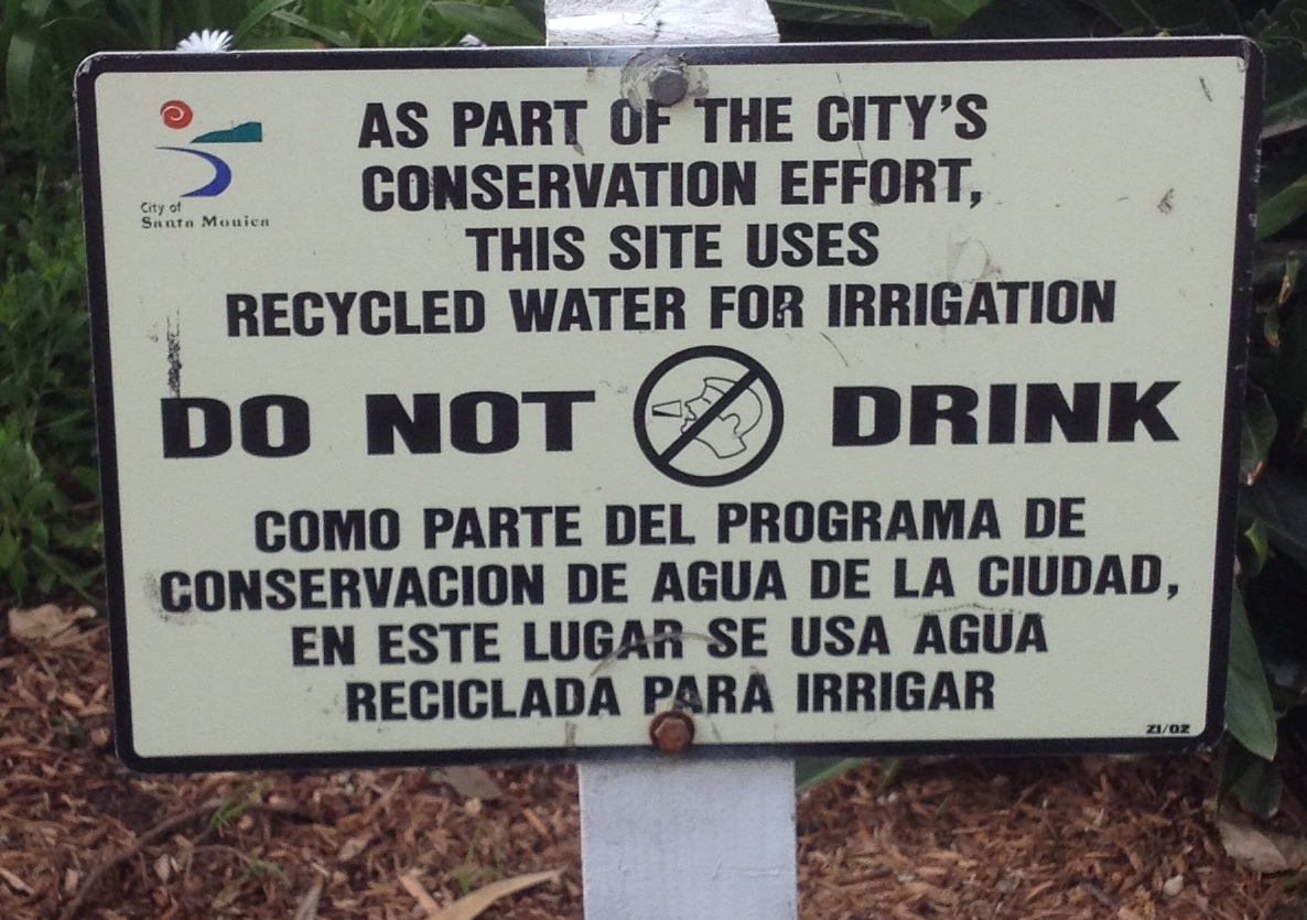 There’s actually a lot going on in this sign, normatively. It signals the City’s feel-good focus on conservation. There’s also the vagueness of the reference to “recycled” water. (Um, greywater? Sewage? Runoff?) Then there’s the vagueness regarding whether the do-not-drink rule is a health thing (if, e.g., the “recycled” water is sewage) or a water-conservation thing.