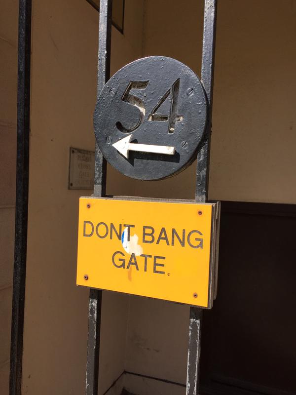 Of course, context matters — the sign makes a lot more sense once you realize that it’s posted at the bottom of an escalator, one that leads down from the train platform to the arrivals waiting area.