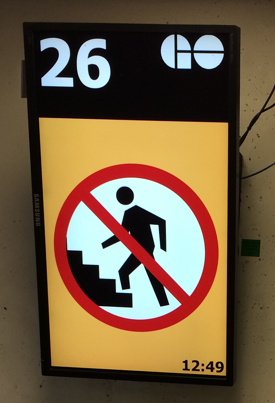 In an era in which most public authorities are trying to promote an active lifestyle by encouraging people to use the stairs, the sign shown here (from Toronto’s Union Station) is, at first glance, rather jarring.