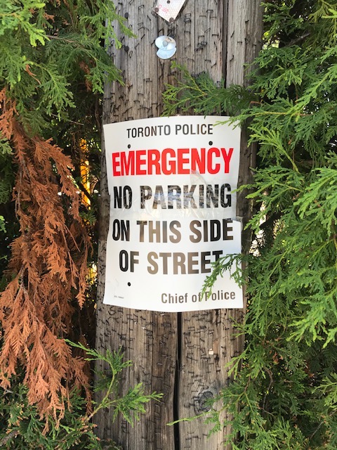 Here’s an example of a sign that simply gives too little information. It’s posted on a residential street in Toronto (near Ossington and Dupont), along with several others like it. The weathered look of the paper, and the growth of the surrounding greenery, suggests that the emergency — whatever it was — wasn’t recent.