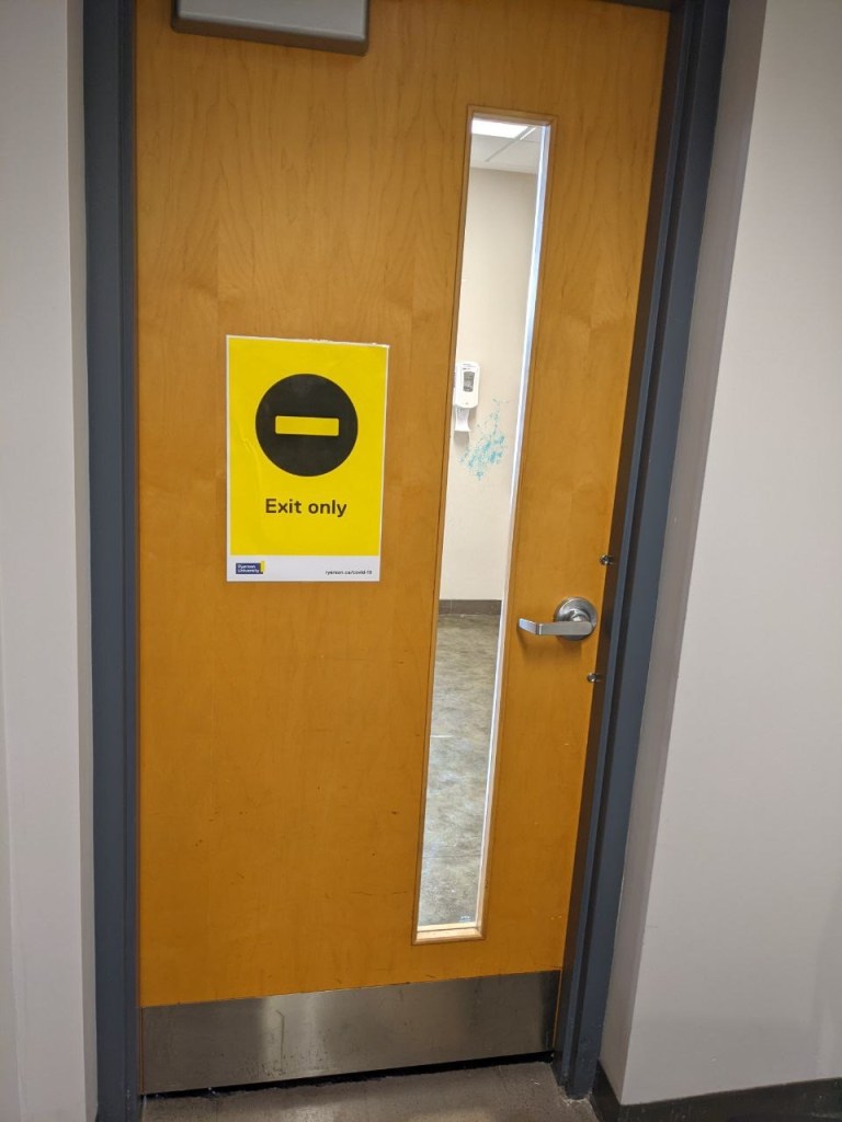 The sign below is on the inside — yes the inside — of the exit door for a university classroom. The words seem to affirm that, yes indeed, this is the exit. But the symbol above it is the universal symbol for “NO ACCESS” or something similar. The result is deeply confusing, though it would be interesting to see how many people really are confused in practice, and whether they do in fact hesitate or avoid using the door as a result. The sign, of course, is supposed to be on the OTHER side of the door, to prevent people from entering via the exit door.